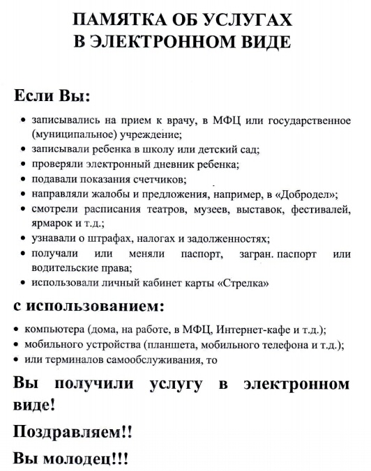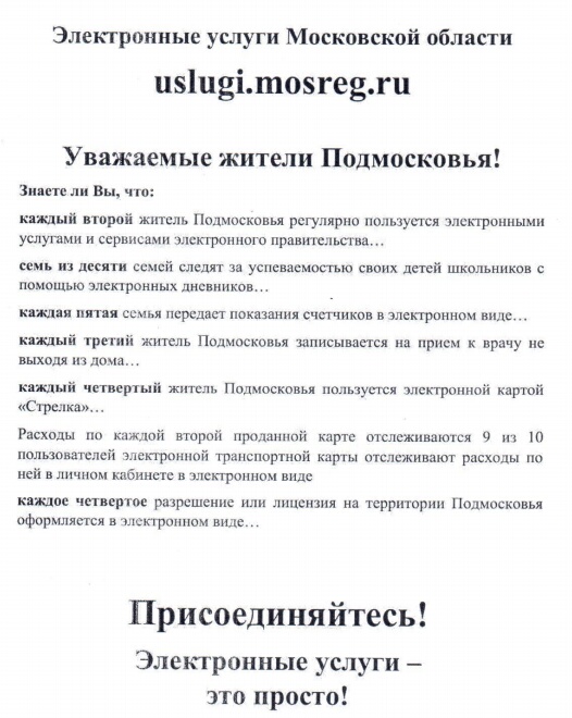 Памятка «Электронные услуги» Автор записи: Запись опубликована:23.11.2017 Рубрика записи:Дачнику на заметку / Новости Портал Государственных и муниципальных услуг Московской области находится в тестировании. https://uslugi.mosreg.ru/ Вам также может понравиться Тарифы, принятые на Общем собрании СНТ «Нарцисс» 09.08.2021 Отчет 2024 13.08.2024 В Жестылёво перекроют дорогу 18.04.2013