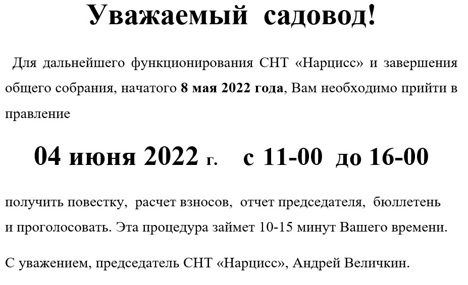 Собрание Автор записи: Запись опубликована:30.05.2022 Рубрика записи:Новости Метки: Общее собрание Еще статьи Предыдущая записьОбщее отчетно-перевыборное собрание Следующая записьОчередное собрание СНТ «Нарцисс» Вам также может понравиться Получить квитанцию по электричеству 5.11.2016. 05.11.2016 Протокол № 6 от 23.08.2013 Заседания Правления. 11.09.2013 Кочующие свиристели. 21.03.2015