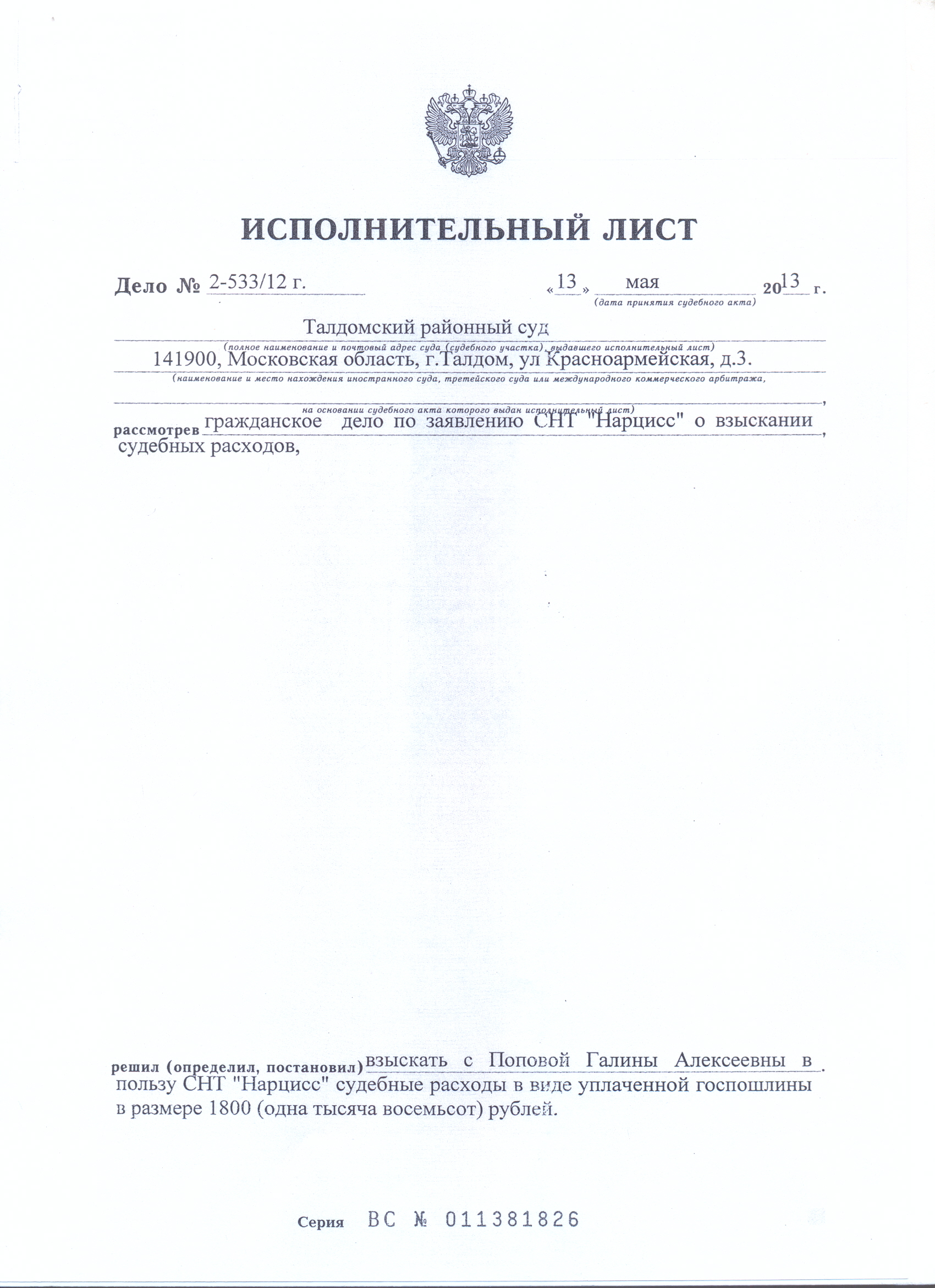 Исполнительный лист по делу №2-533/12 г.